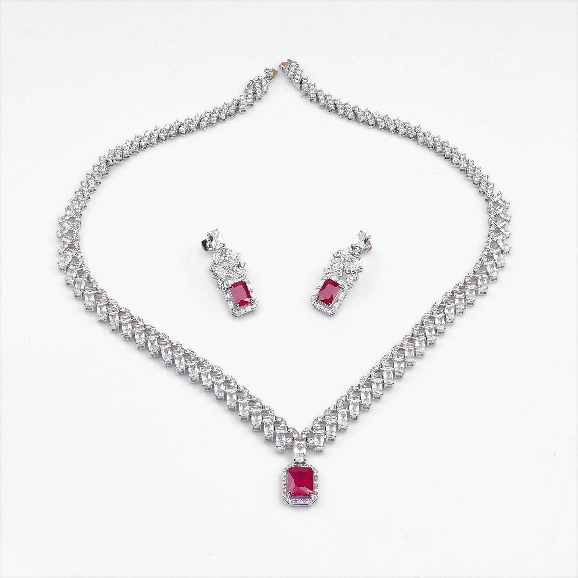 Make a bold statement with the captivating "Crimson" set. Each piece features a sleek, crimson-hued rectangular stone, brilliantly complemented by a cascade of sparkling white crystals. This modern ye...