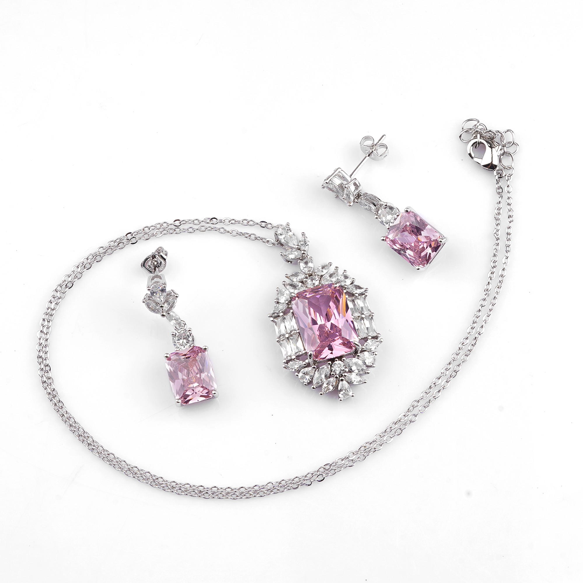 Adorn yourself in timeless elegance with the "Radiant Rose" jewelry set. This exquisite collection features a stunning necklace and matching drop earrings, each showcasing a brilliant, rose-hued gemst...