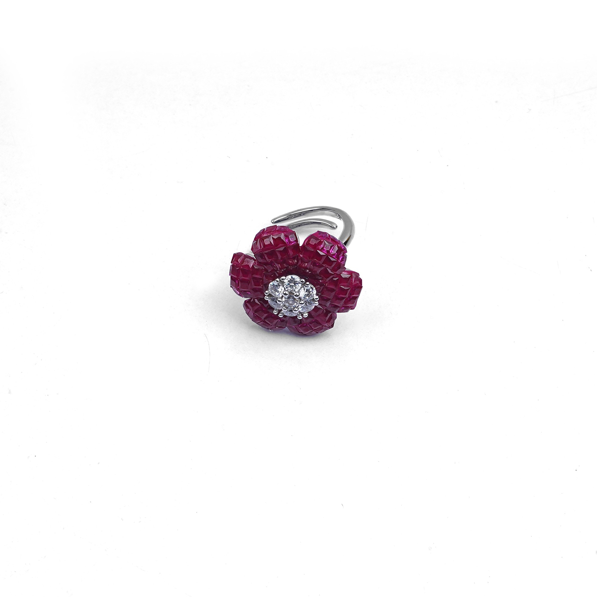 This elegant ring features crimson-colored petals that have a faceted, sparkling texture. A single, luminous stone is at the center, making it a bold and beautiful accessory.