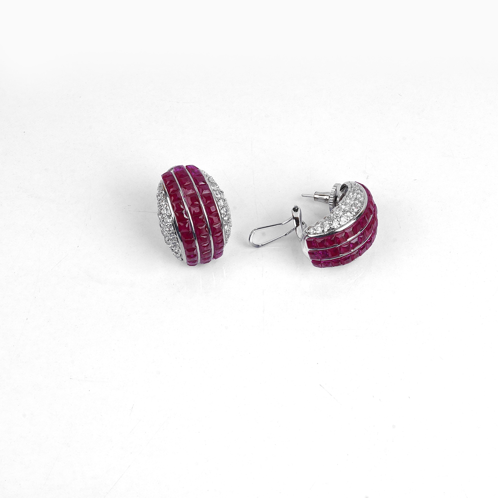 These dazzling earrings feature two rows of vibrant red stones set in a sparkling pavé style, framed by a border of brilliant white cubic zirconia. Their chic, curved design adds a rich pop of color ...