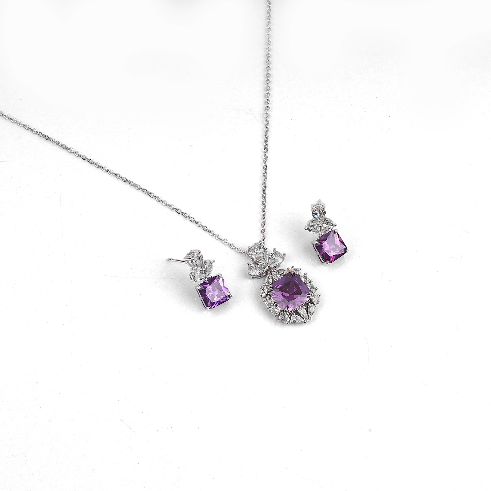 This stunning three-piece set features a necklace and matching earrings, each with a vibrant, central amethyst cubic zirconia stone. The brilliant silver-tone finish and surrounding clear stones highl...