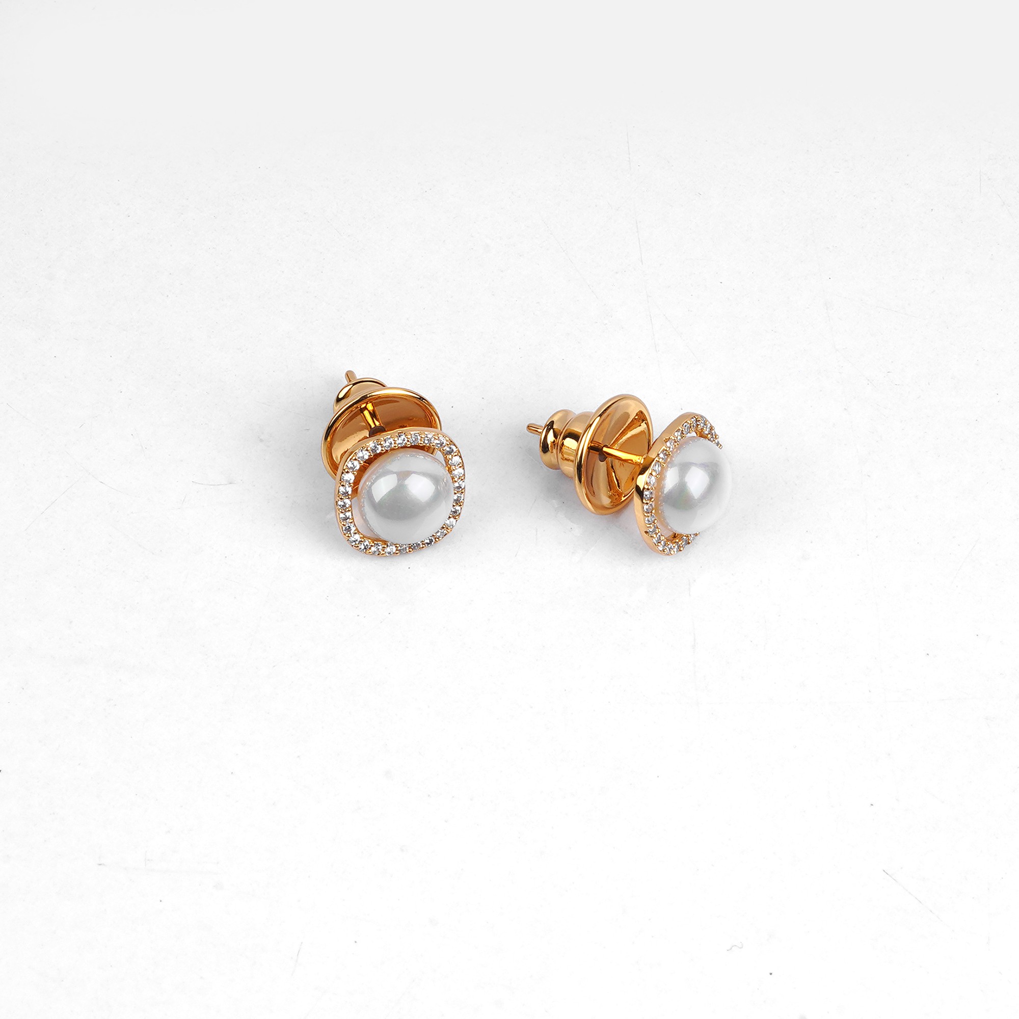 These stunning golden pearl studs feature a luminous pearl at the center, surrounded by a radiant, square-shaped halo of brilliant cubic zirconia stones. The warm gold tone of the setting beautifully ...