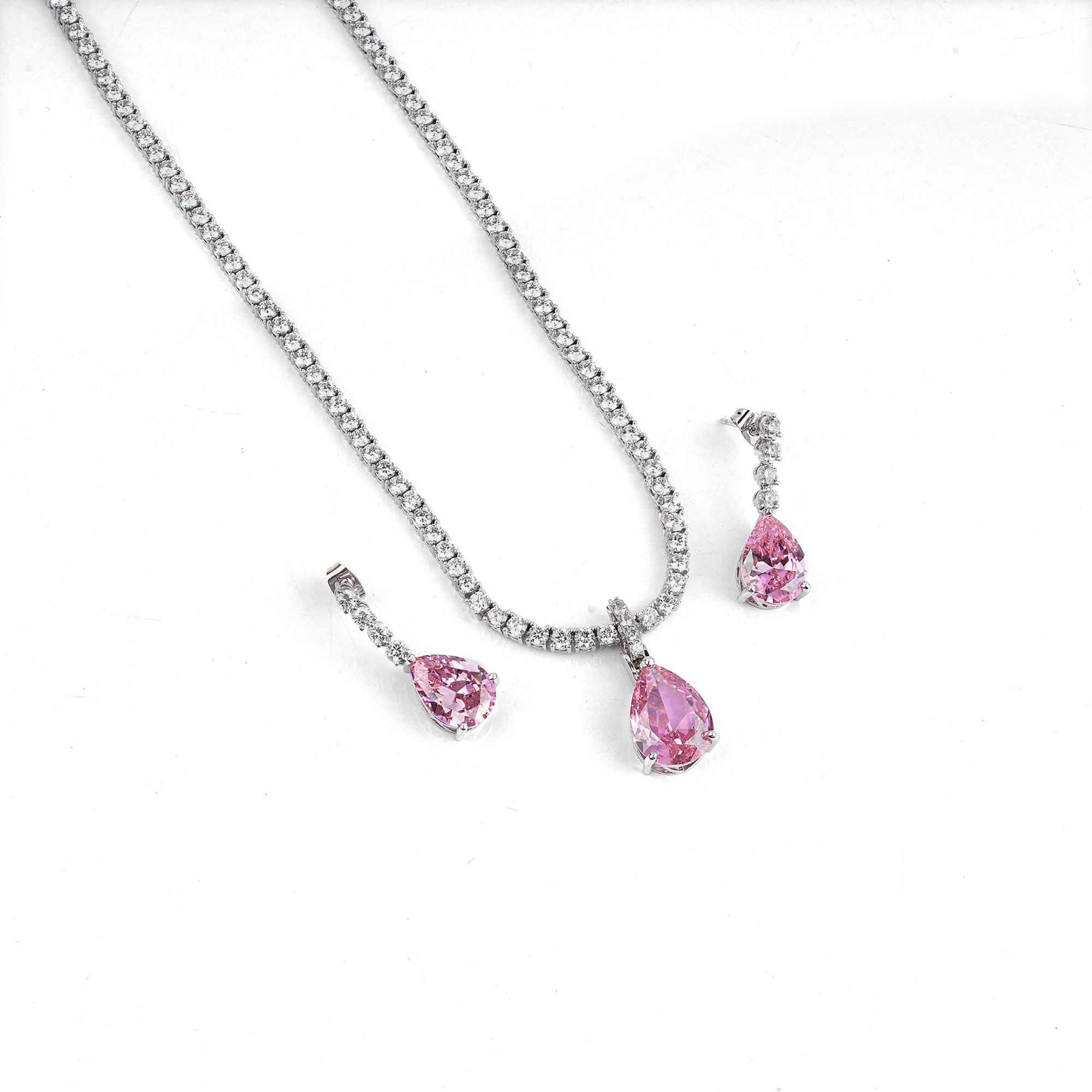A classic and elegant jewelry set featuring a brilliant tennis necklace and matching drop earrings. This set is beautifully accented with a sparkling pink teardrop stone, creating a look that is both ...