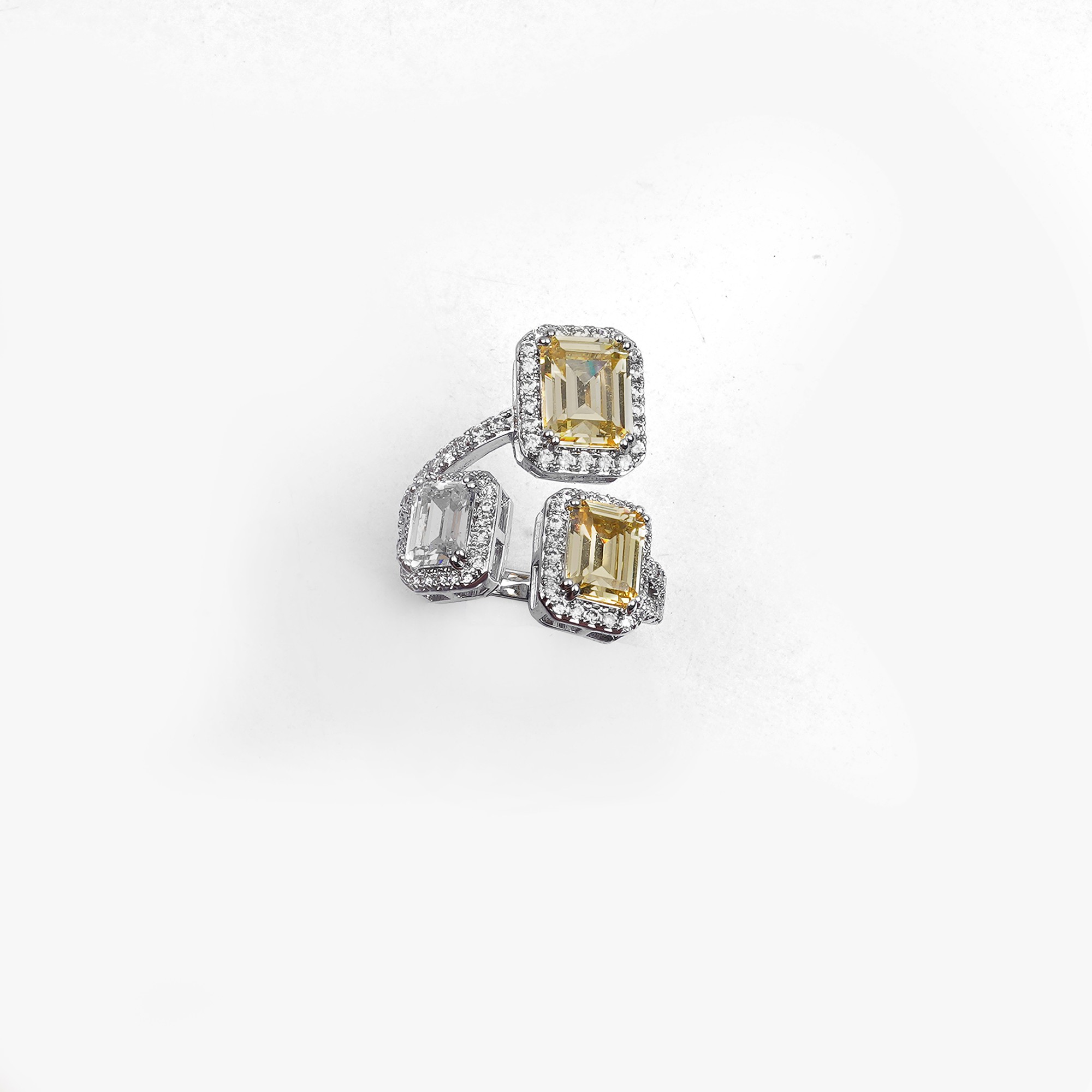 This unique ring showcases a modern, two-tone design with three stunning stones. Two vivid yellow rectangular-cut stones and one brilliant white rectangular-cut stone are each surrounded by a sparklin...