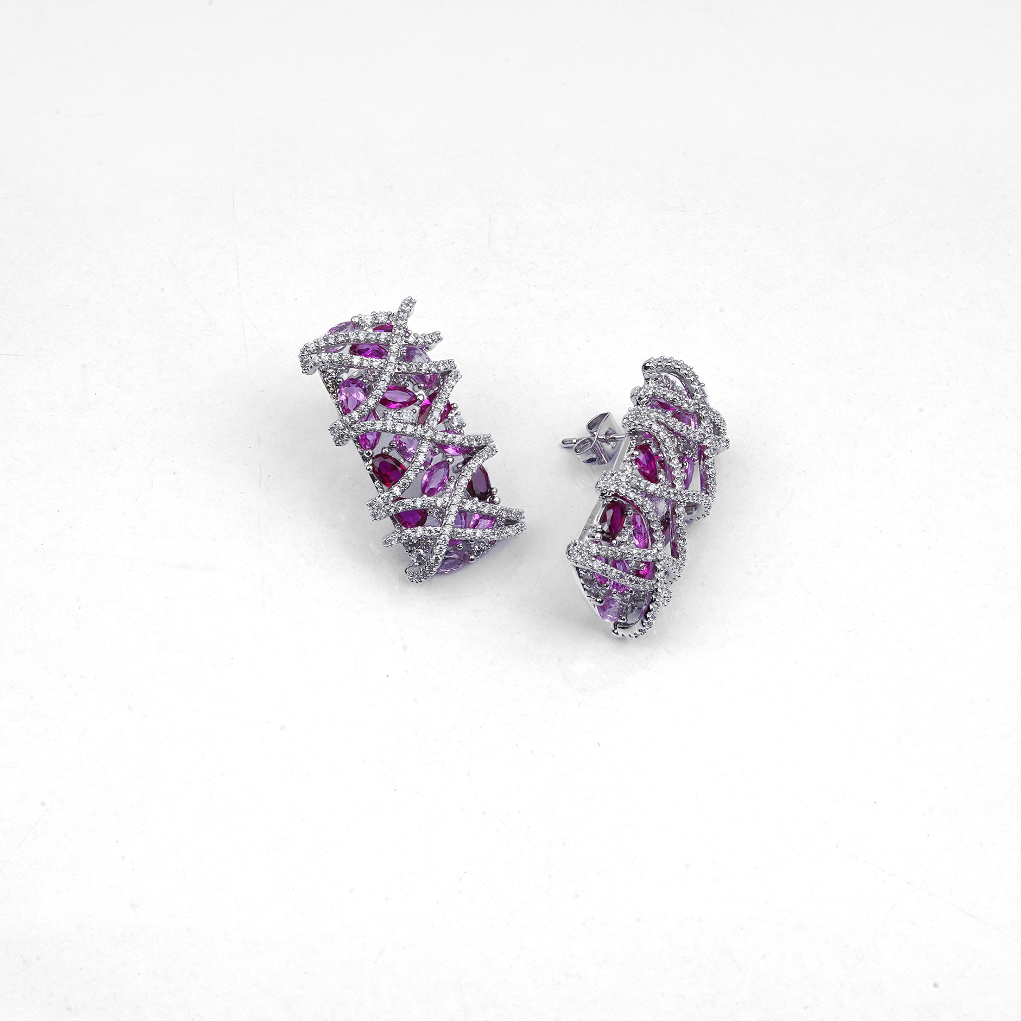 Elegant, silver-toned clip-on earrings featuring a bold, wide design. A sparkling lattice of white crystals intertwines with beautiful deep amethyst-purple stones, creating a sophisticated and strikin...