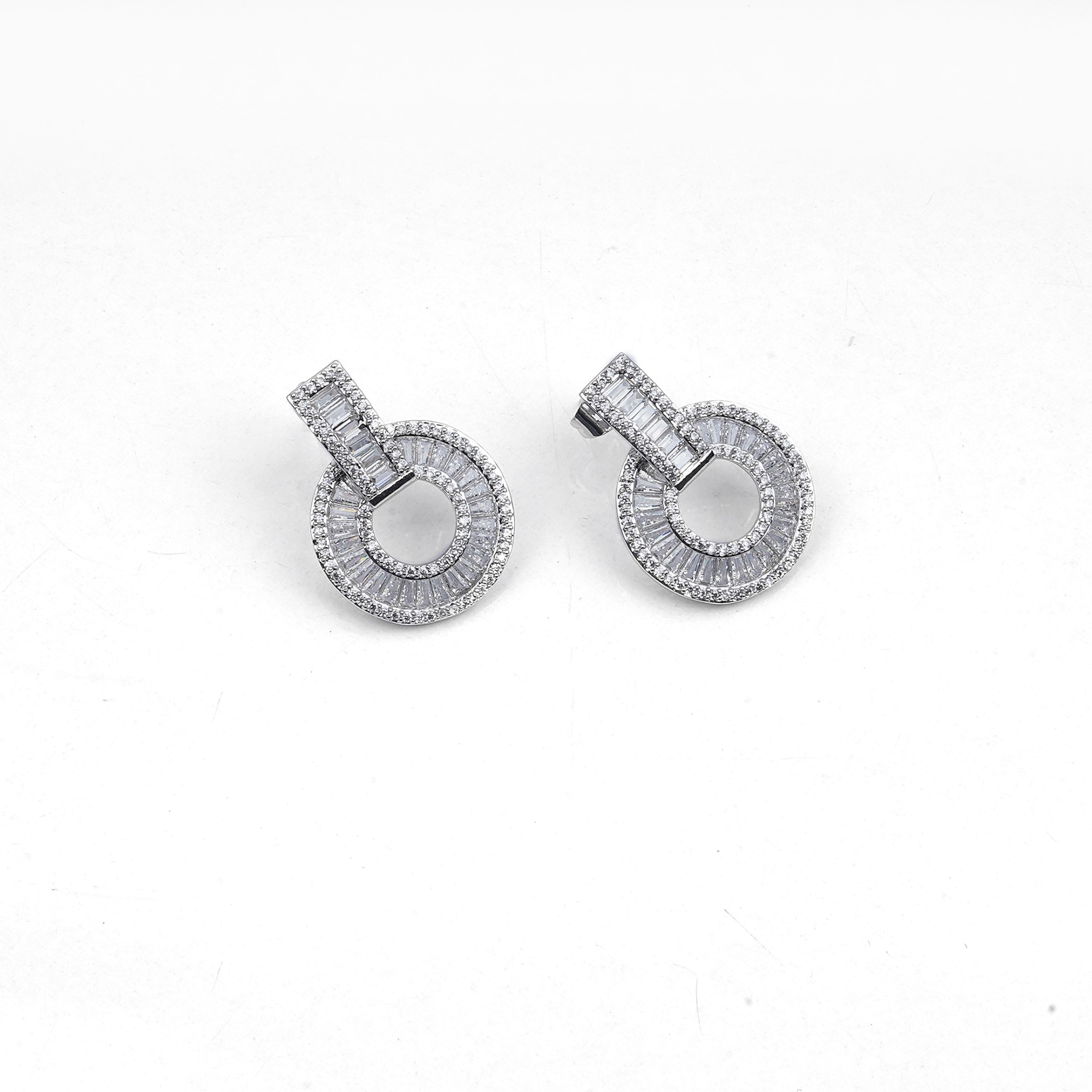 Elegant, silver-toned drop earrings featuring a bold, geometric design. They combine a radiant hoop of brilliant baguette-cut crystals with a chic, rectangular stud, creating a modern and eye-catching...