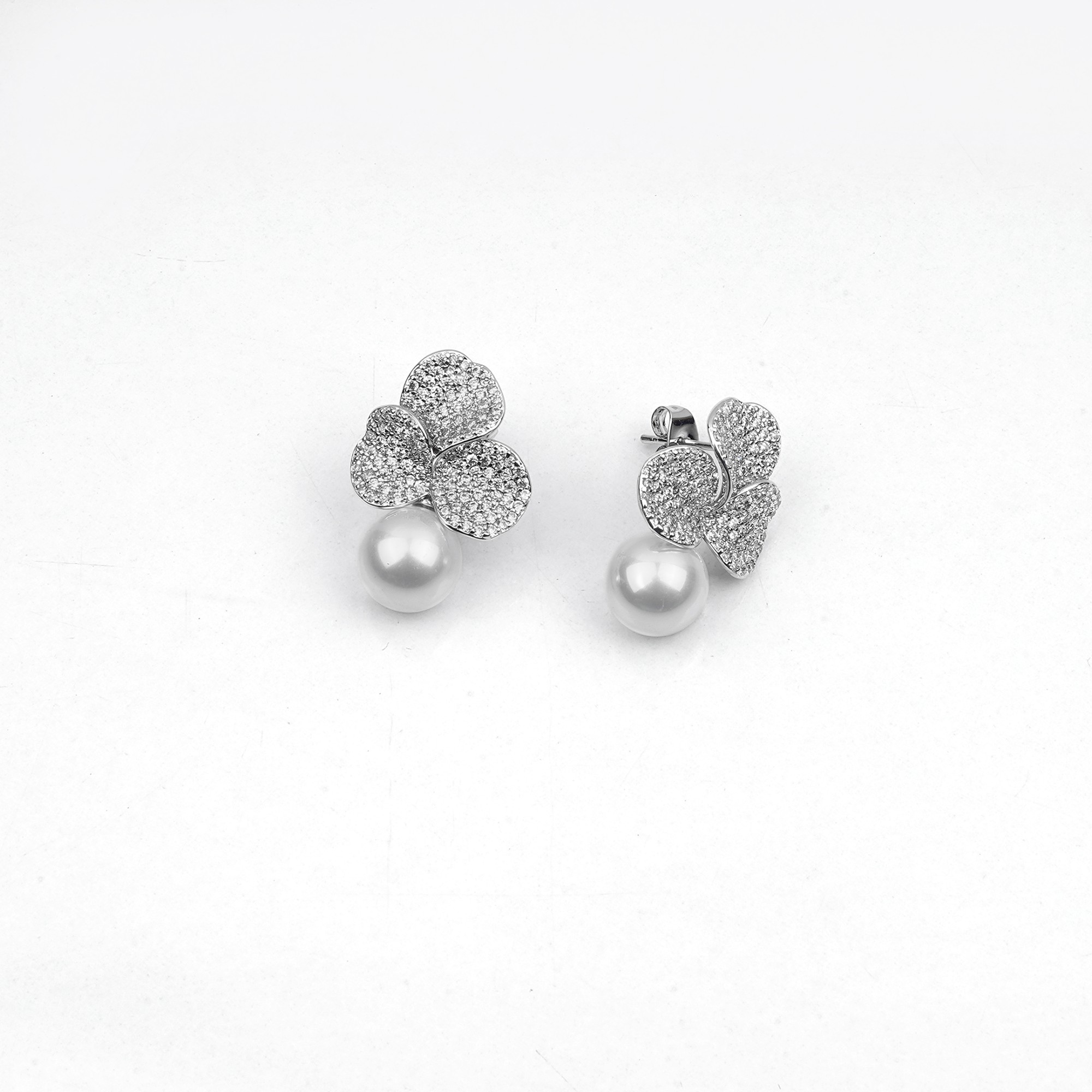 Elegant silver-toned stud earrings with a stunning two-part design. A sparkling, pavé-covered floral top leads to a luminous pearl drop, creating a sophisticated and graceful look....
