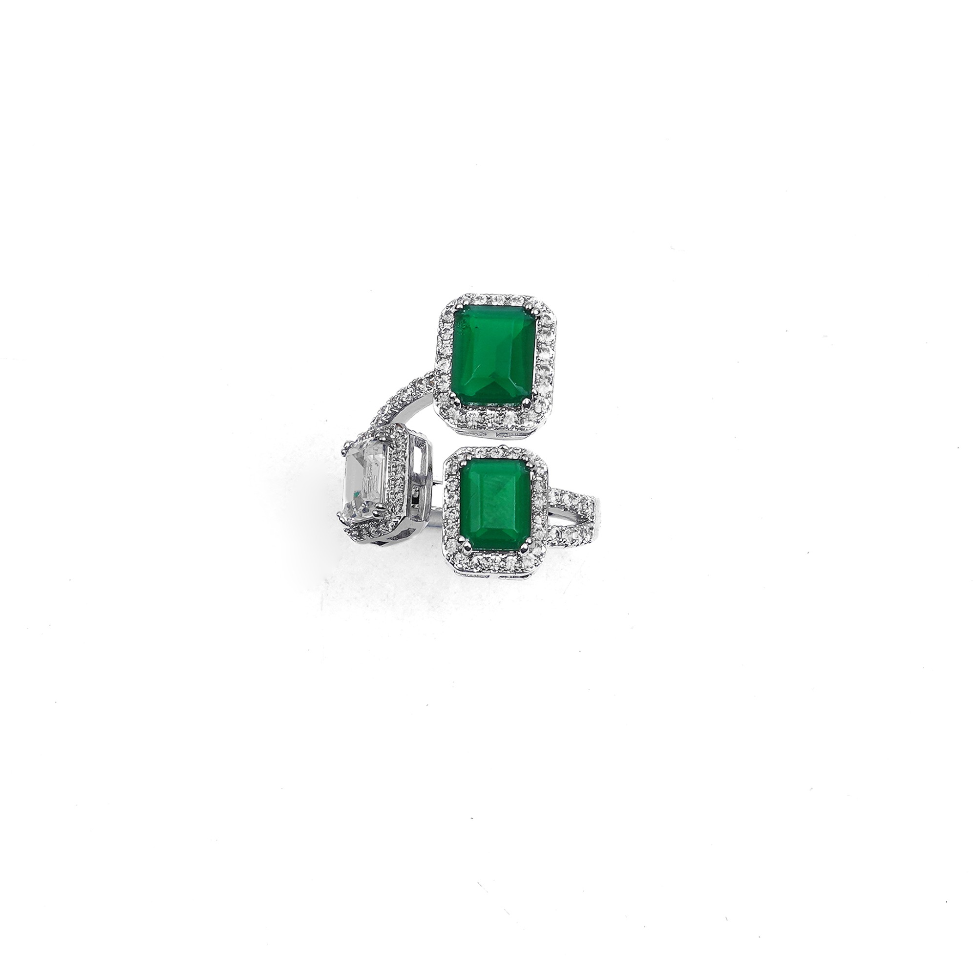 This beautiful ring is a stunning statement piece with three striking stones. It features two vibrant green emerald-cut stones and a single white diamond-cut stone, all set with sparkling halos. The b...