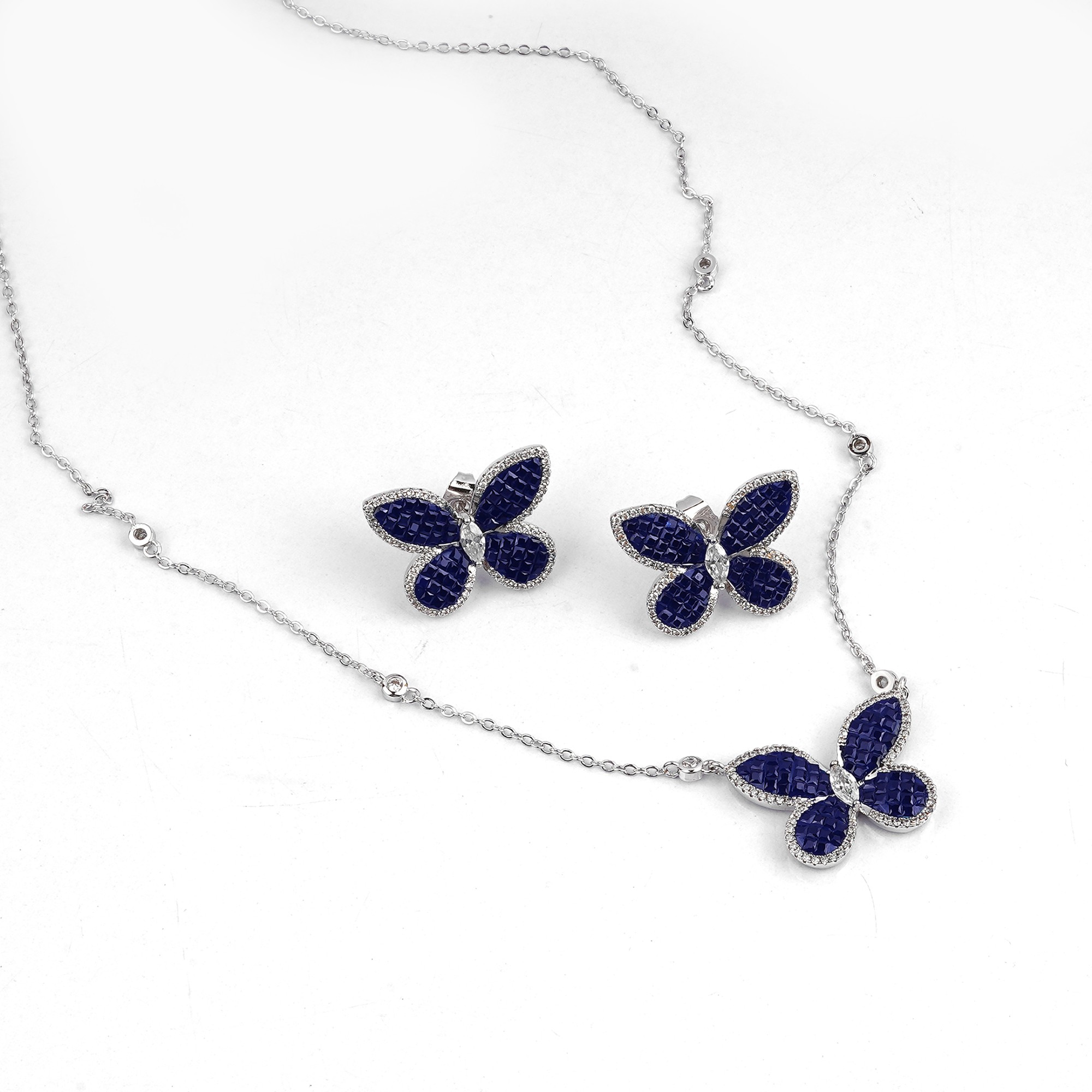 This enchanting jewelry set features delicate butterfly designs on both the necklace and matching earrings. Each butterfly is adorned with deep blue pavé stones and a single, brilliant white gem at i...