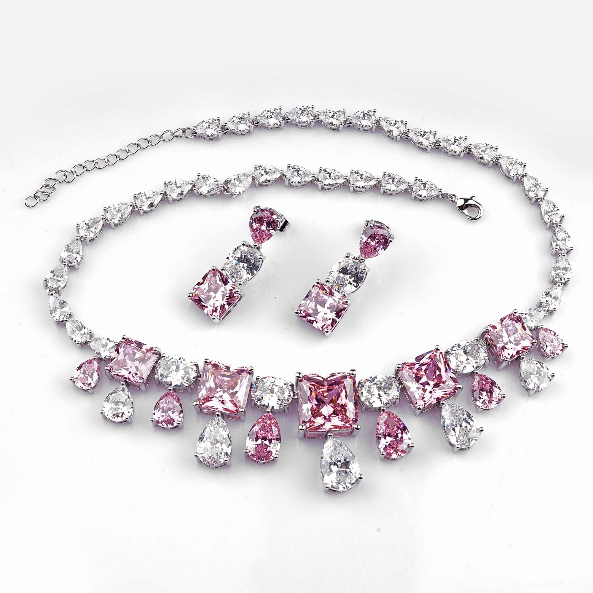 Command attention with the breathtaking "Pink Diamond Symphony" set. Inspired by the harmony of colors and shapes, this set features prominent pink and clear stones in both princess-cut and pear-cut s...