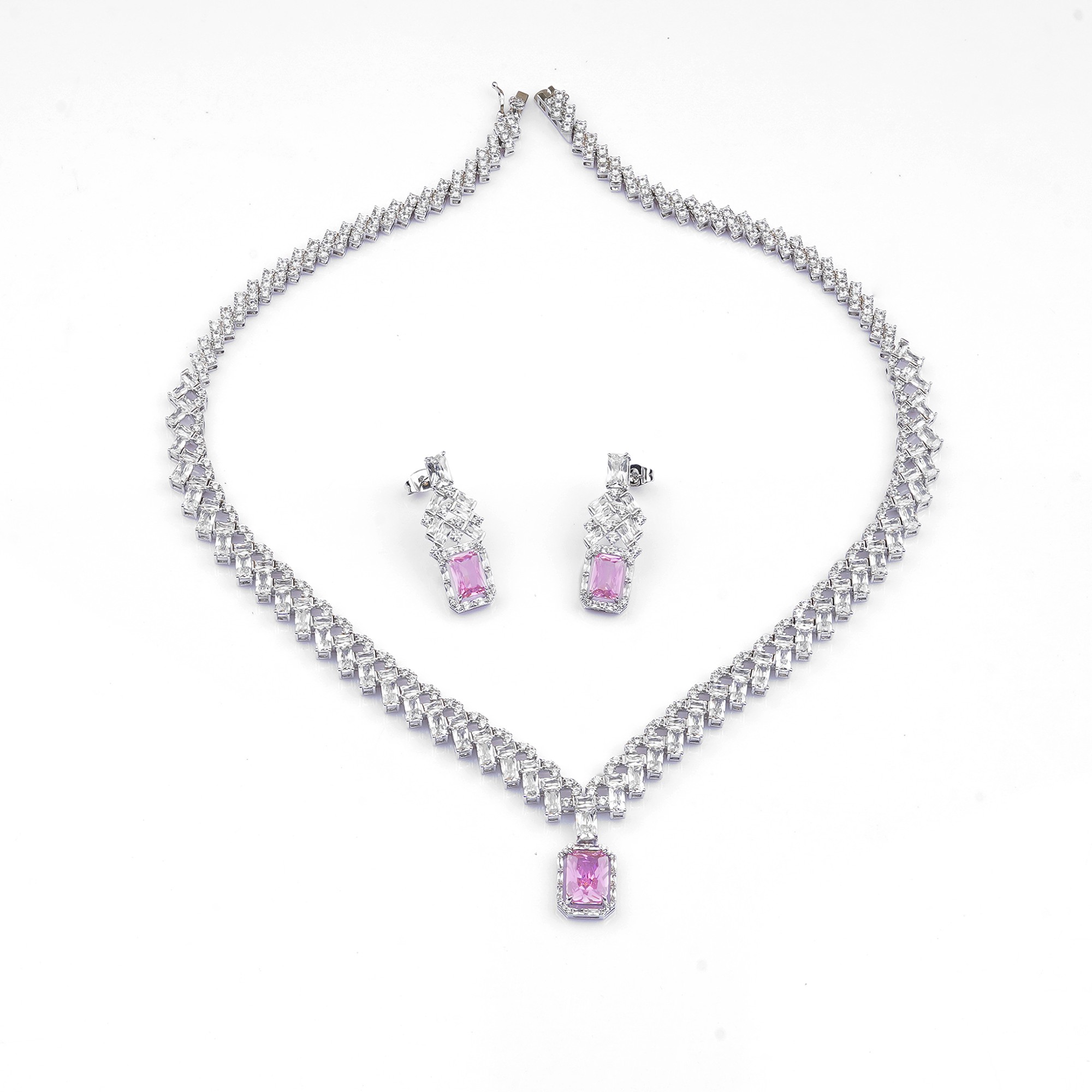 Make a bold statement with the captivating "Rosewater" set. Each piece features a sleek, rose-hued rectangular stone, brilliantly complemented by a cascade of sparkling white crystals. This modern yet...