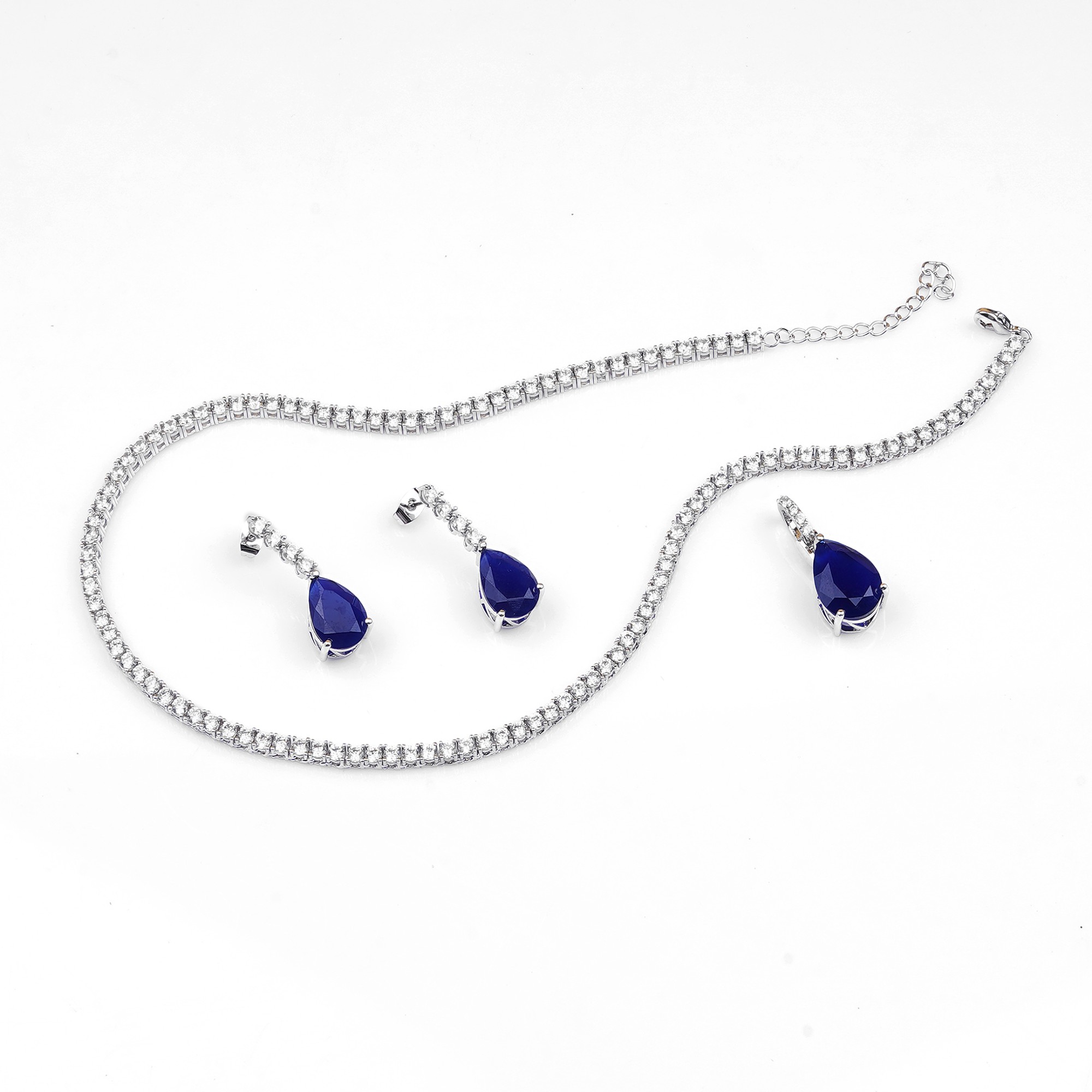 Make a subtle yet stunning statement with the "Sapphire" set. Each piece features a sleek, sapphire-hued teardrop stone, brilliantly complemented by a cascade of sparkling white crystals. This modern ...