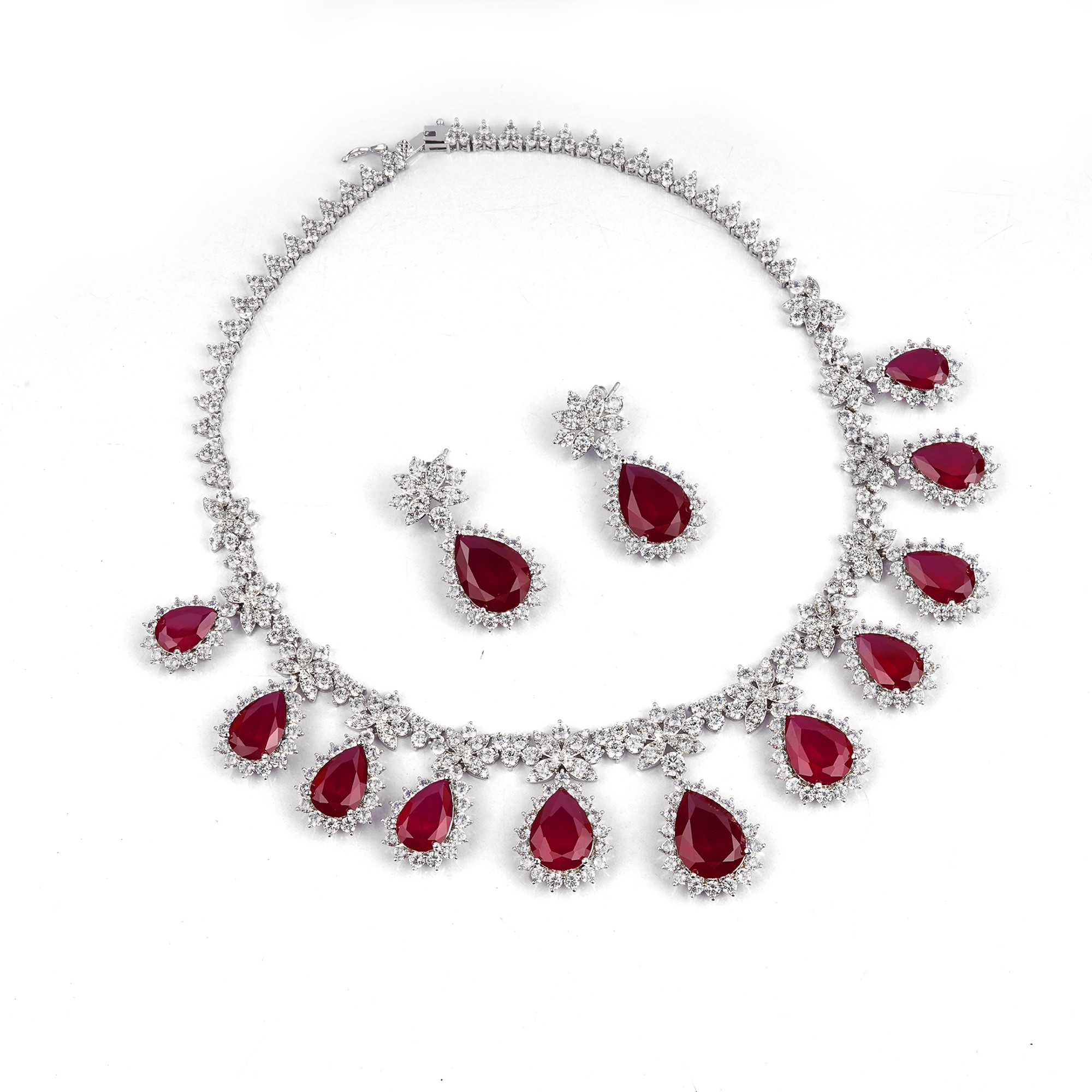 A spectacular statement set featuring a brilliant diamond-cluster necklace and matching teardrop earrings. This set is designed with vibrant, pear-shaped ruby-red stones that cascade elegantly, creati...