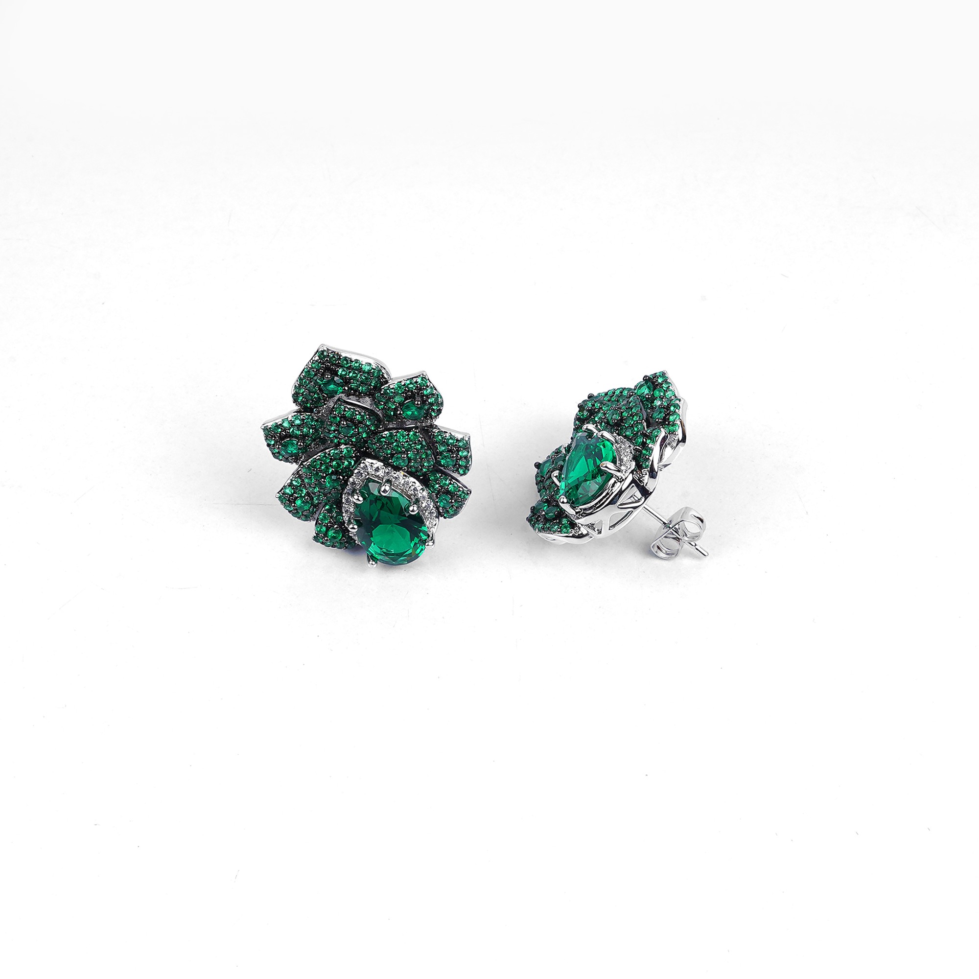 These dazzling earrings feature a brilliant emerald-green stone at their center, surrounded by a cascade of smaller green stones that create a stunning, floral design. Crafted to catch the light from ...