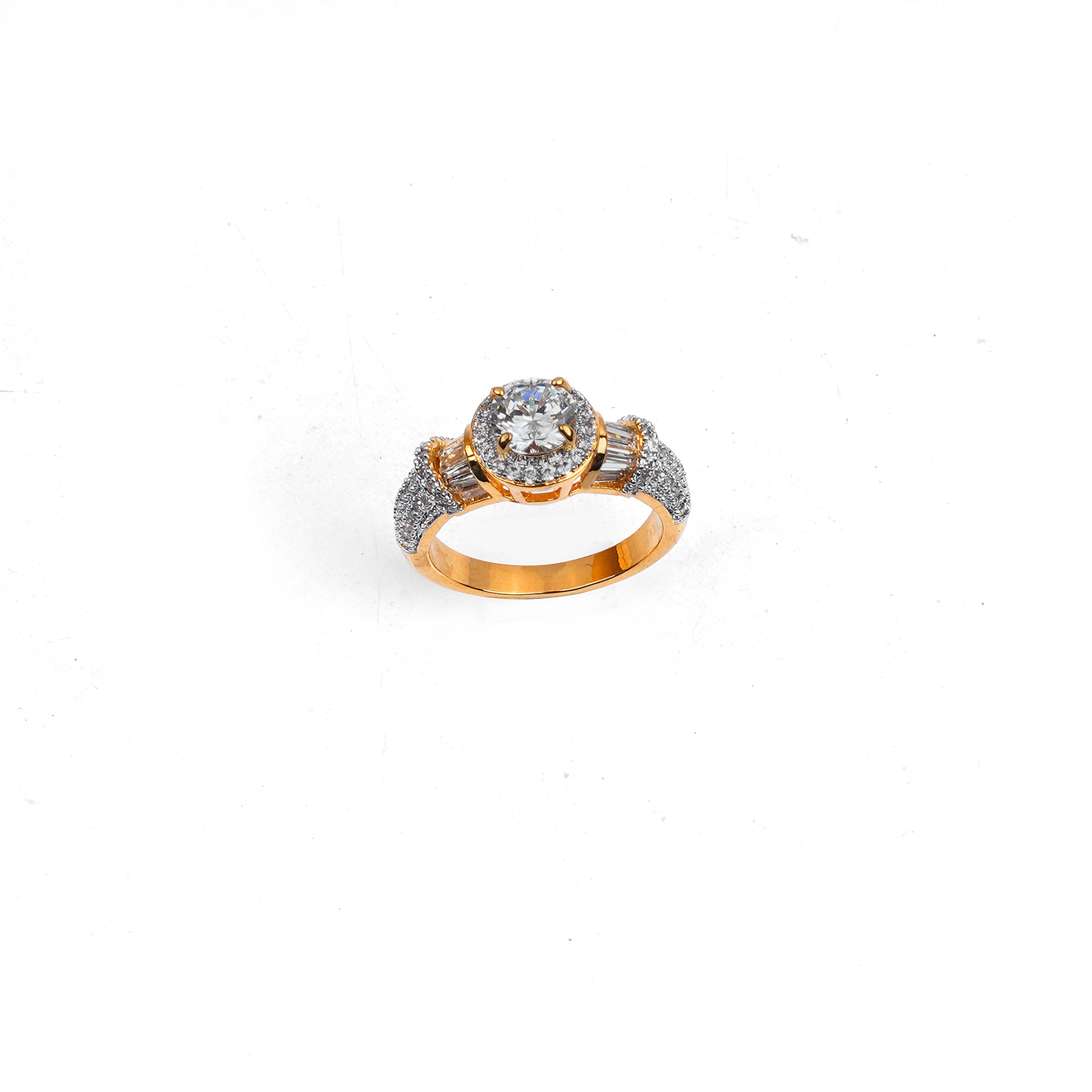 A stunning gold ring featuring a brilliant central diamond enveloped by a sparkling halo, with accent diamonds along the band for added glamour.